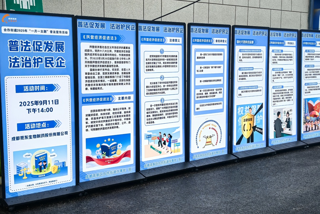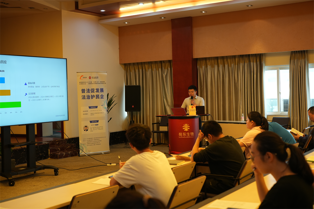 2025年9月11日,由中共成都高新区工委全面依法治区委员会办公室主办,中共成都高新区工委政法委员会、成都高新技术产业开发区应急管理局承办,成都高新区合作街道办事处、成都苑东生物制药股份有限公司、万商天勤成都办公室协办的“法律七进”巡回讲堂第七期顺利举行。本期活动走进成都苑东生物制药股份有限公司,以“《民营经济促进法》宣讲指引——法治护航民营经济高质量发展”为题,开展普法活动。
