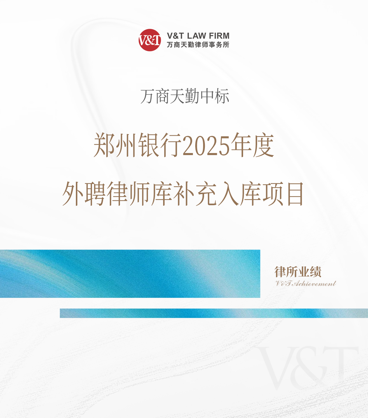 近日,万商天勤高磊律师团队凭借在银行与金融领域的专业实力与丰富的实务经验,成功中标郑州银行2025年度外聘律师库补充入库项目。