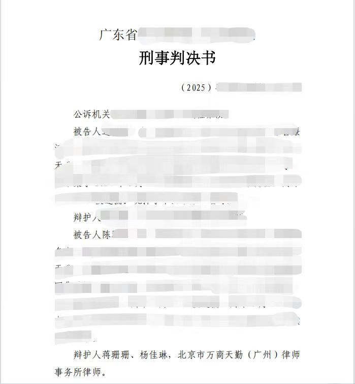 陈某等人涉嫌组织领导传销活动罪一案,陈某案发时已成为传销组织的第四层级,在涉案六名嫌疑人中排序第二,其涉嫌“在传销活动中承担管理协调、宣传培训等职责”,参与传销资金超2000万元。因该案在当地具有重大影响,陈某经检察院批捕被羁押在案。万商天勤广州办公室在陈某逮捕后接受家属委托,指派蒋珊珊律师担任陈某的辩护人。接手案件后,辩护律师通过羁押必要性审查程序,成功在一周内为当事人争取到取保;后续在检察机关建议对陈某量刑五年六个月的情况下,通过有效辩护为当事人争取到判三缓五的判罚。